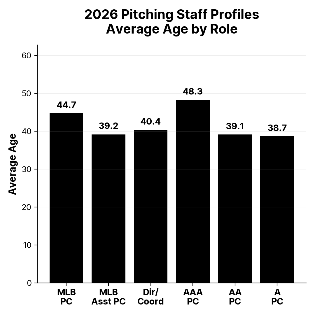 In the dataset, AAA pitching coaches were the oldest group on average and had the highest percentage of professional playing experience. If MLB is trending toward system leadership, AAA remains the point where organizations still appear to value traditional experience—often because the job demands it.