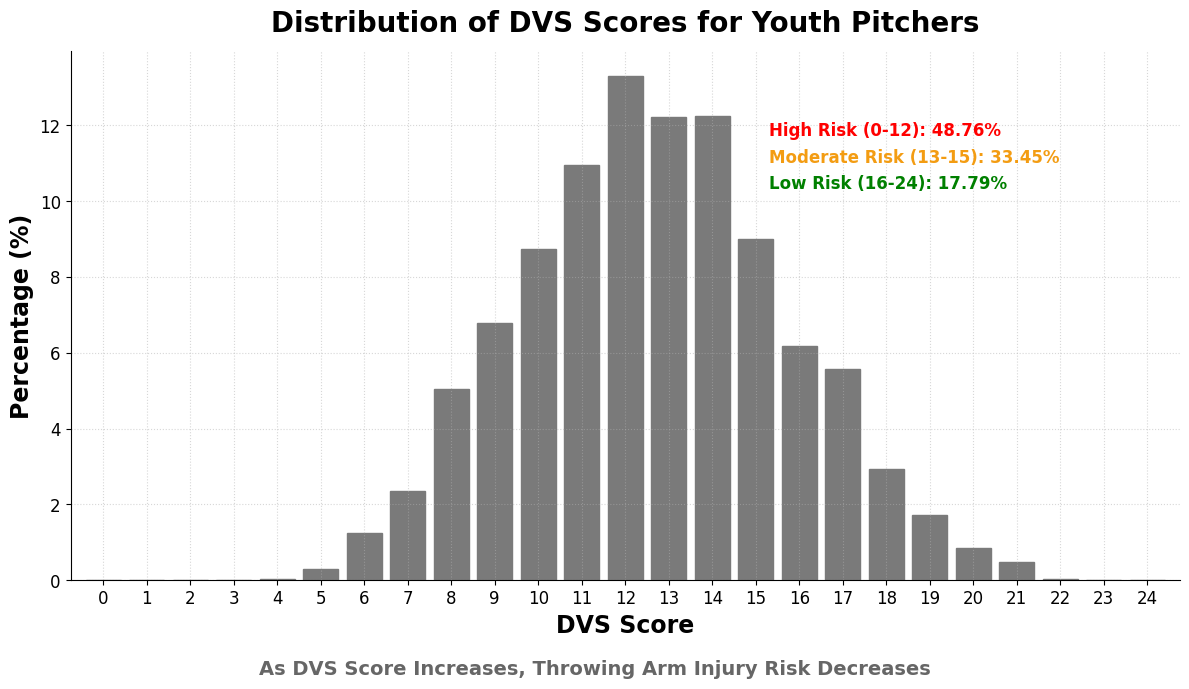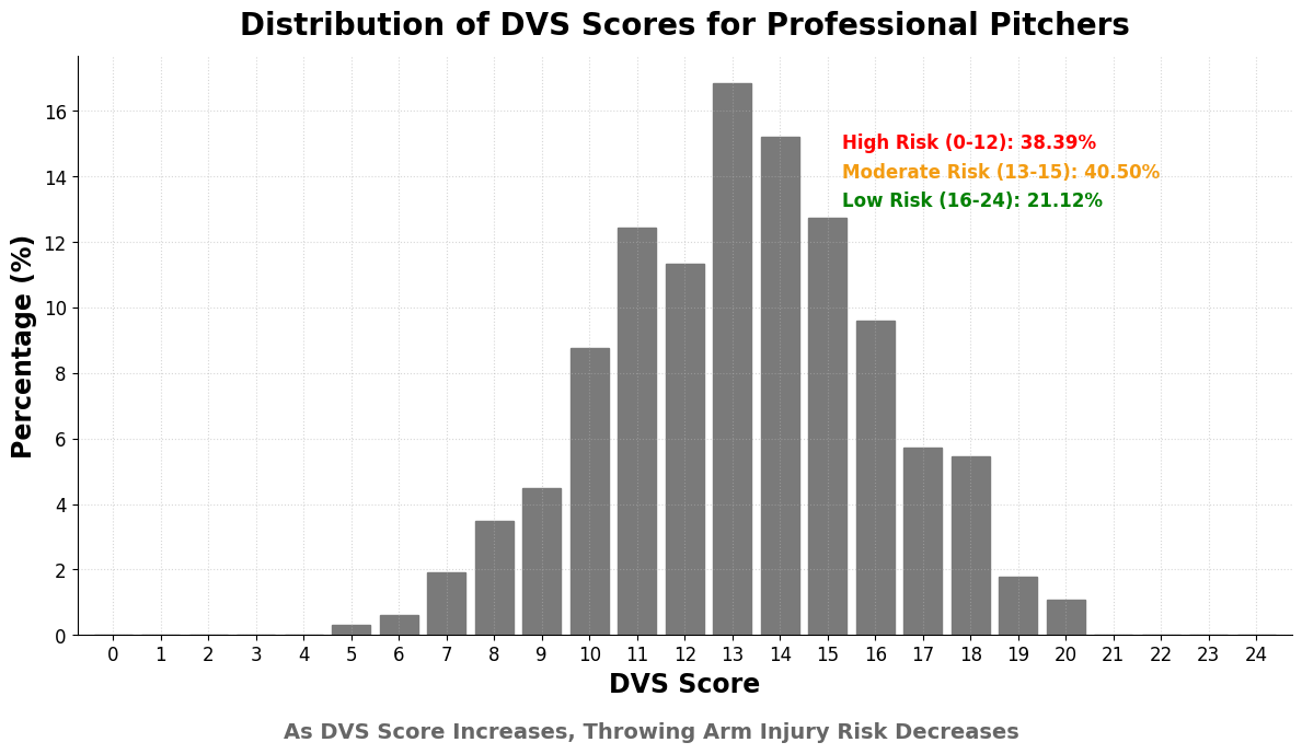 But when you look at population patterns, the distribution isn’t random. In our dataset, roughly 45% of pitchers fall at a total DVS Score of 12 or below—the portion of the population our model flags as higher risk mechanics.