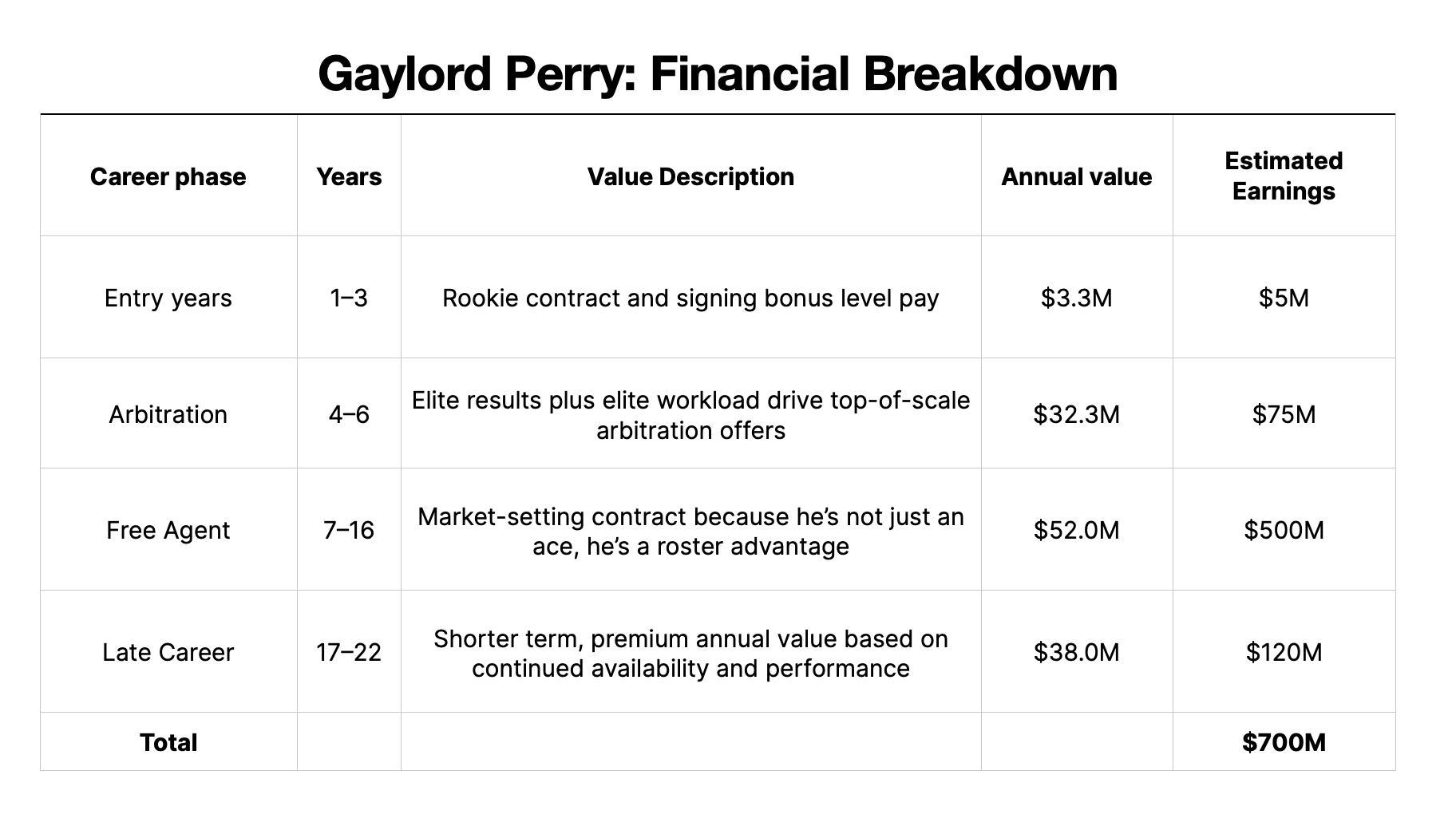 By a straightforward WAR based valuation, Perry’s career lands in the low $700 millions. The estimate isn’t meant to be perfect. It’s meant to show what the market would do with a pitcher who could stay available long enough for greatness to compound.
