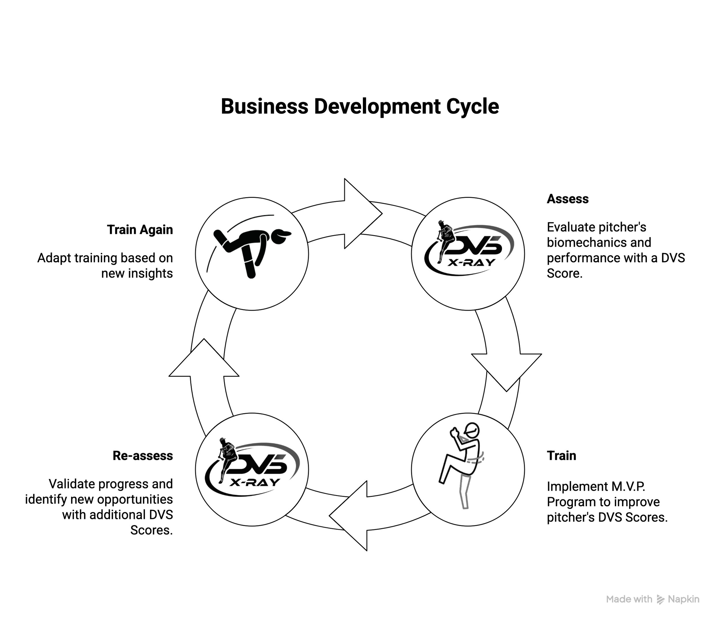 DVS is designed as a continuous development loop—not a one-time assessment—so facilities can guide pitchers over time with clarity and consistency. This loop repeats throughout the season and across years—creating continuity instead of guesswork.
